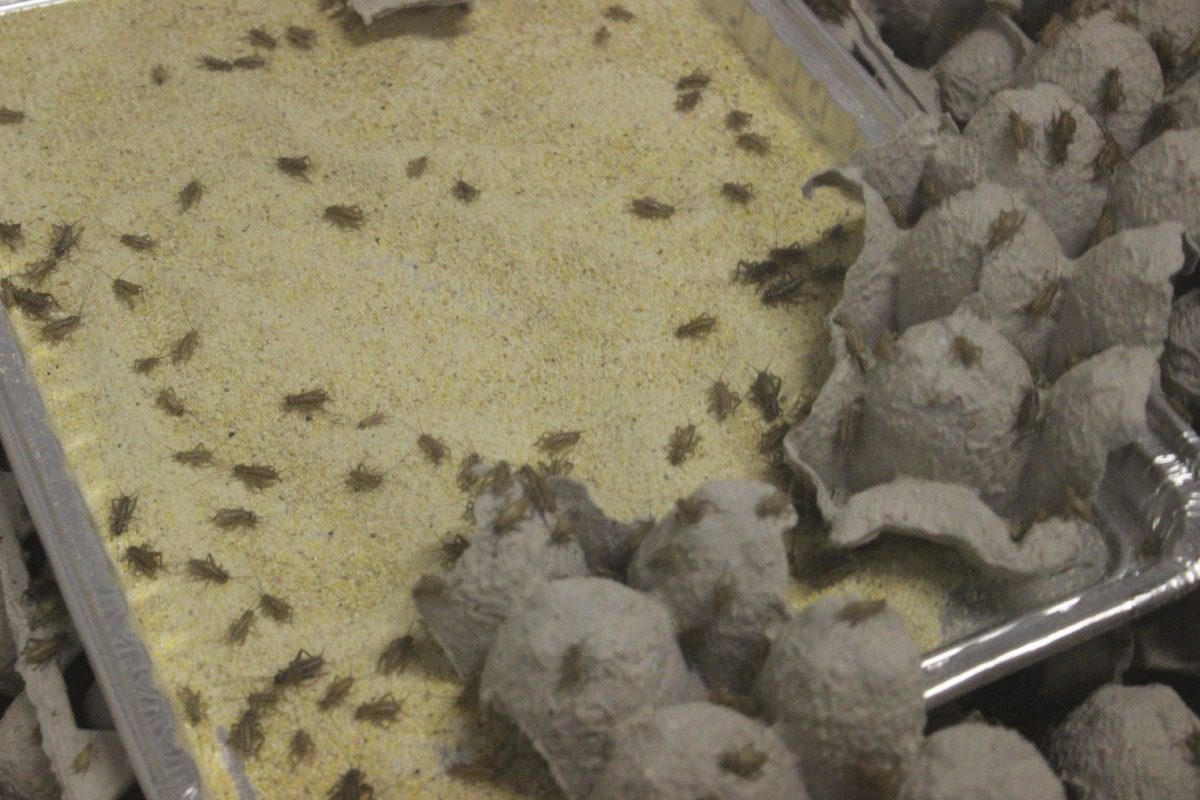 Each trough of crickets is fed and watered up to twice a day, and monitored almost around the clock.