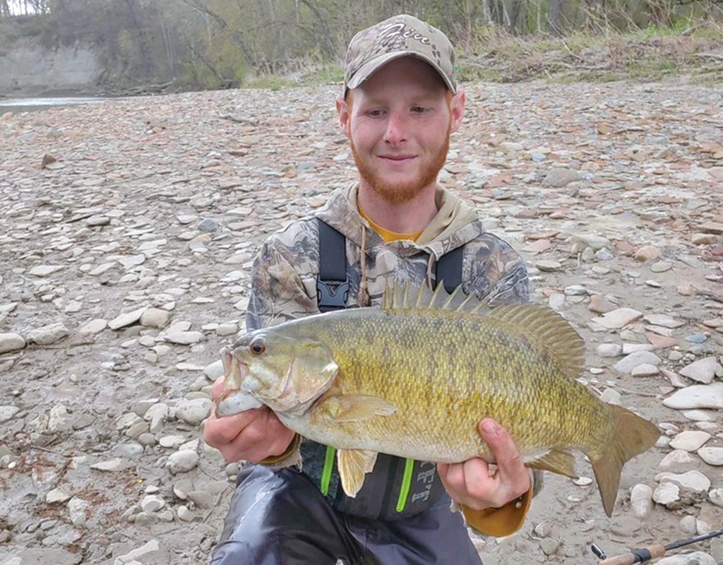Zak Kmiec holds up a sizable smallmouth bass he pulled out of the Chagrin River river on May 10, 2020.