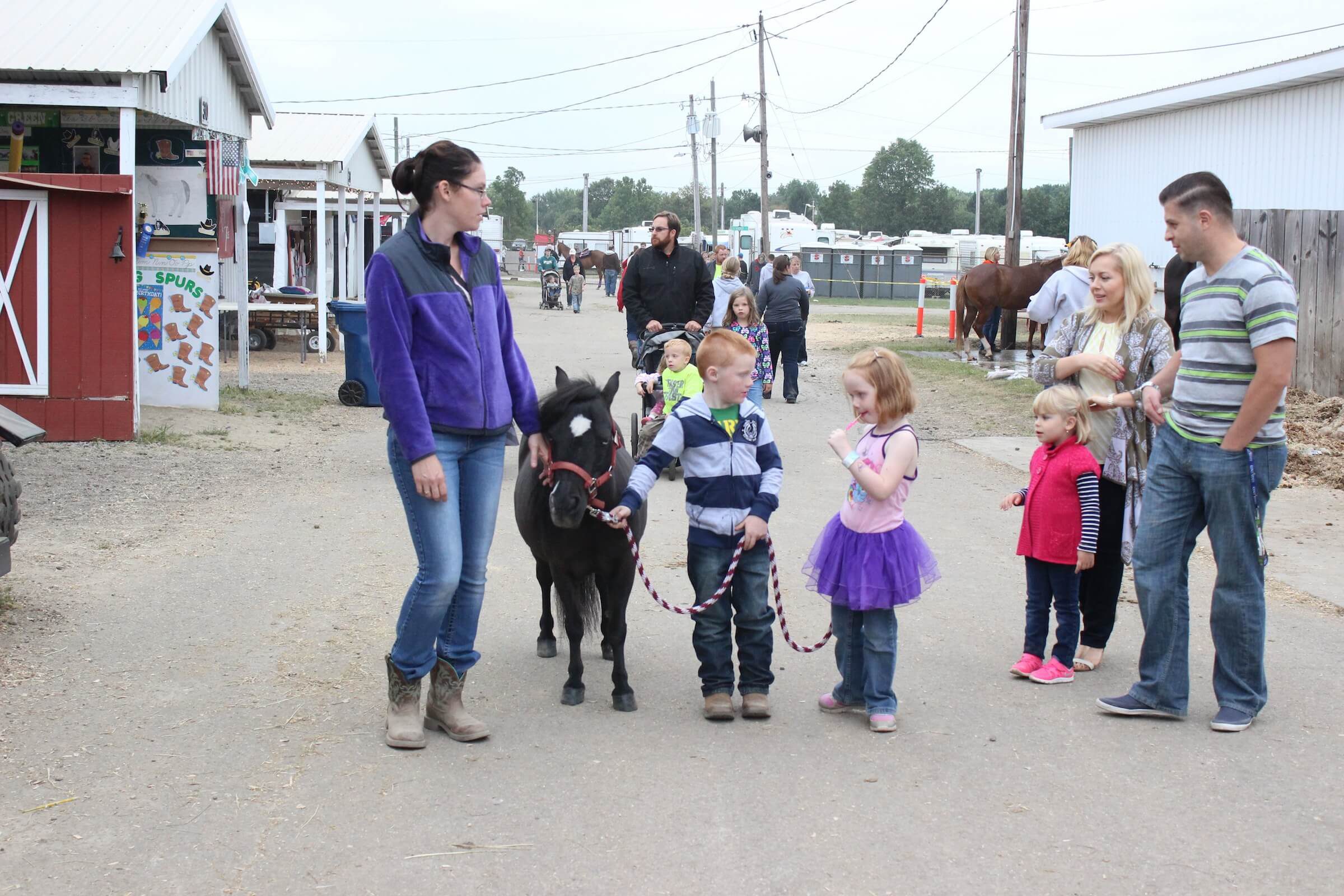Christine Clark (left), Liam Clark, 5, and Kelsey Wade, 4, walk their miniature horse at the Portage County Fair Aug. 26. Other fairgoers stop to meet the horse. (Catie Noyes photo)