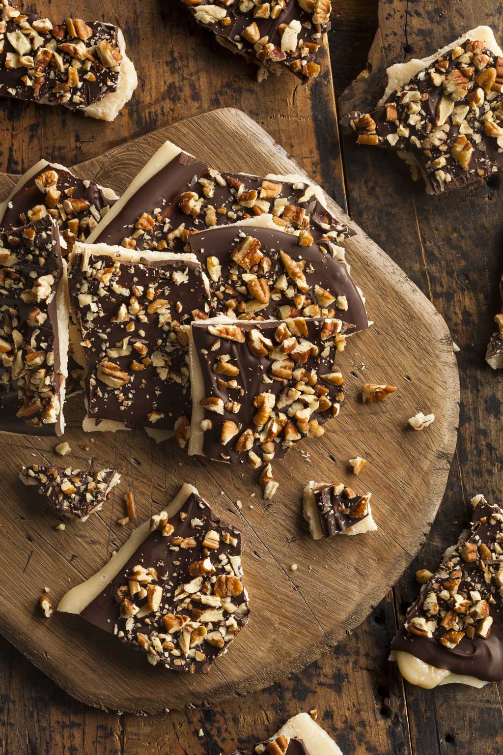 13. Evenly sprinkle the toffee with chocolate; as soon as the chocolate is melted, spread with a spatula to cover toffee completely.