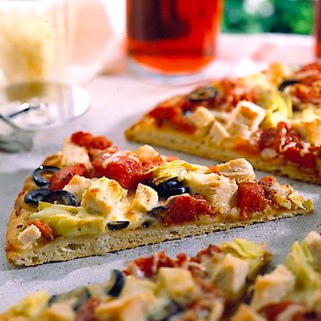 4. Top with drained tomatoes, turkey, artichokes, olives and Parmesan cheese.