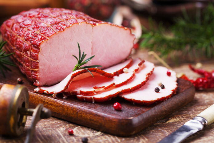 5. Coat ham with juice mixture and arrange pineapple rings on ham. Place a maraschino cherry in the center of each pineapple ring and secure with a toothpick.