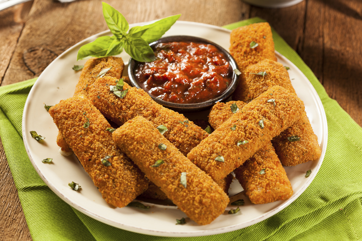 - For making the Mozzarella Sticks: Line a baking sheet with foil, and lightly spray the foil with nonstick cooking spray. Cut each cheese stick in half.