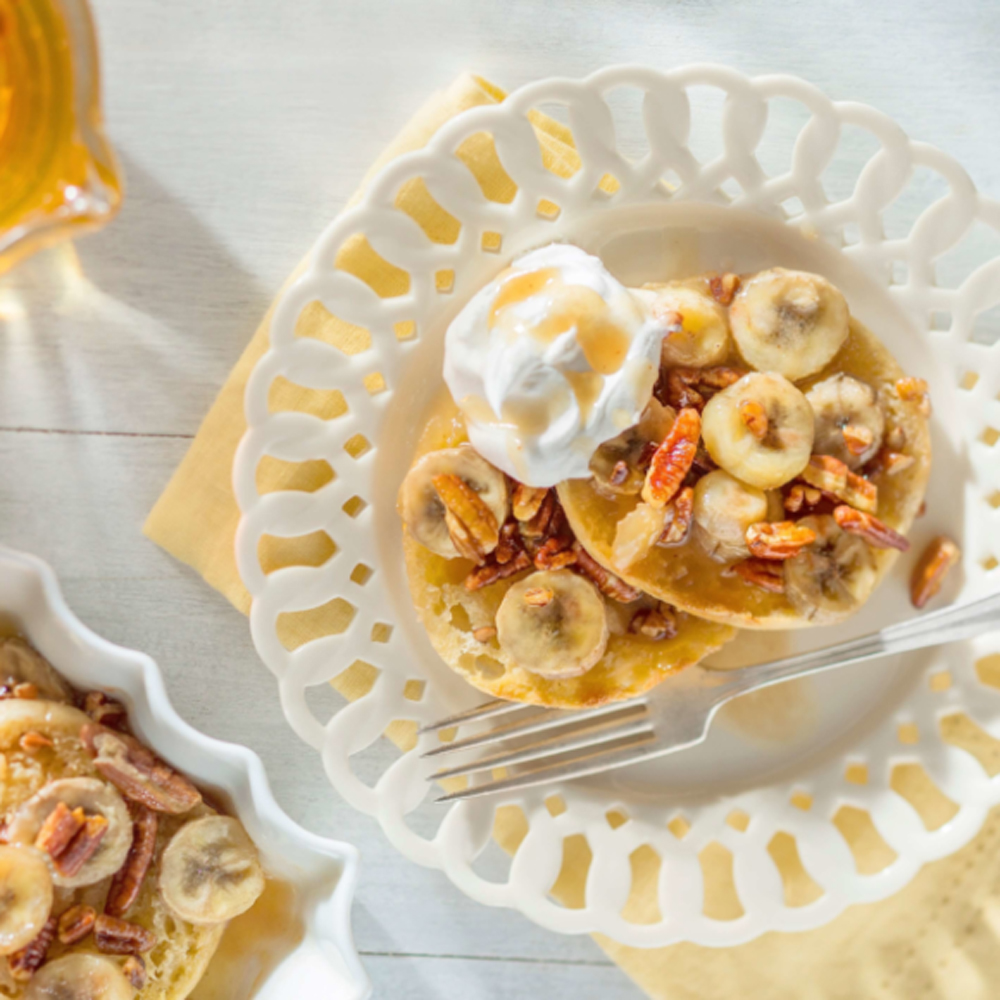 4. Spread banana slices and pecans evenly over the muffins and drizzle the remaining syrup over the bananas.