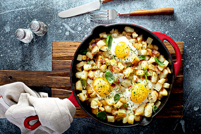 - Use a wooden spoon to make six wells in the pan to crack eggs into. Crack the eggs into each well and sprinkle them with a little salt and pepper. Sprinkle shredded cheese evenly over everything. Cover pan with a lid and cook over low heat for a few minutes until egg whites are set and cheese is melted.