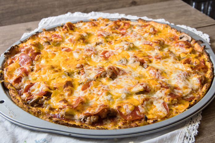 4. Place a 14-inch piece of parchment paper on a half-sheet pan. Pour 2 tablespoons of the oil onto the parchment and dust with the cornmeal. Place the cauliflower mixture onto the prepared parchment. Gently pat the crust into a 12-inch round.
