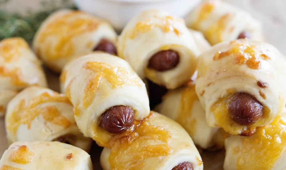 - Turn dough out onto floured surface. Punch dough down and cut in half. Roll into 12- inch rectangle. Sprinkle with remaining cheese. Cut into 16 triangle-shaped pieces. Place a hot dog at the end of each and roll up. Let rise while you preheat oven to 350°F.