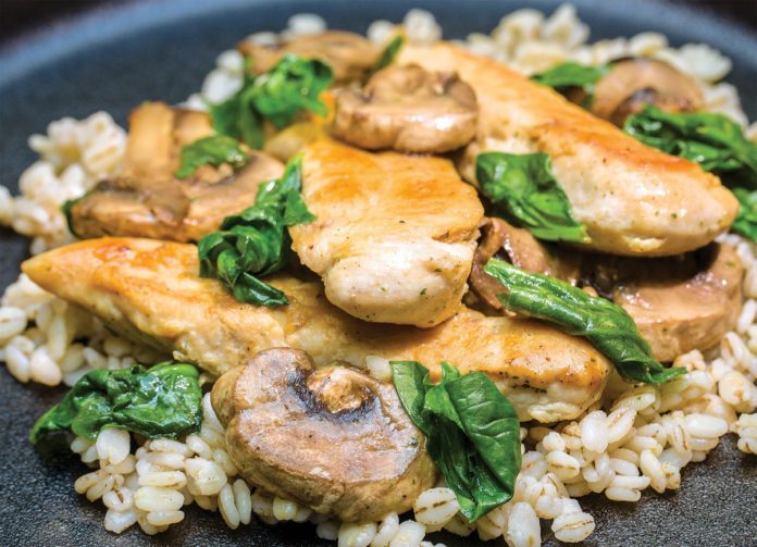 4. Arrange barley or brown rice on plates. Top with spinach, chicken and mushrooms.