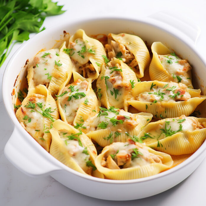 - Lightly grease a 9-by-13-inch pan. Place a small amount of sauce to cover bottom of dish. Fill shells with filling and place in pan. Ladle half of sauce over filled shells.
