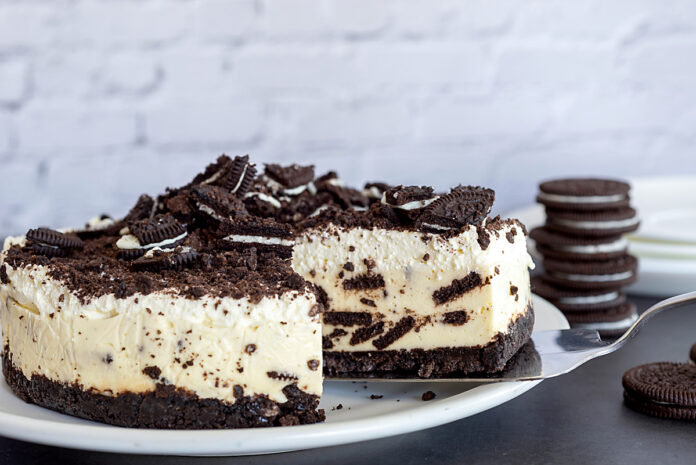 - Remove cheesecake from pan, place on a serving plate and pour white chocolate ganache over it. Immediately garnish with additional chopped cookies.