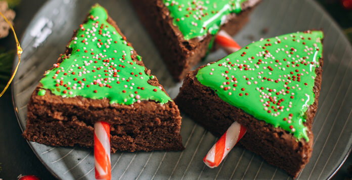 - Starting at the top of the brownie triangles, gently squeeze out the icing in a curvy zigzag as you go down the tree or ice the entire piece. Decorate with sprinkles of your choice.