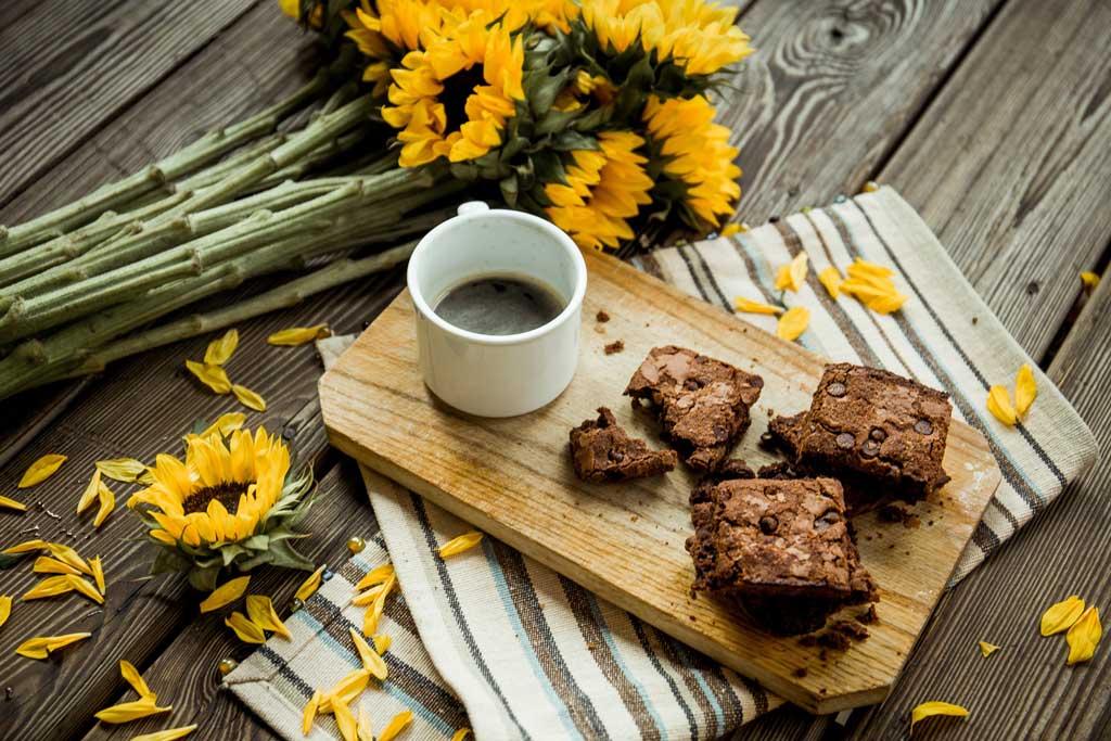 Cinnamon Brownies on a cutting board with a cup of coffee and sunflowers on the table.