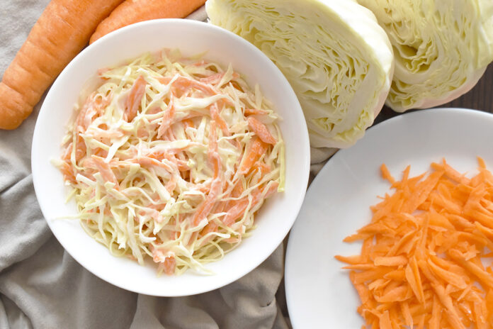 - In a large bowl, mix together the two milks, mayonnaise, sugar, lemon juice and vinegar. Add the onion, carrots and cabbage with salt and pepper. Toss to thoroughly coat the vegetables in the dressing.