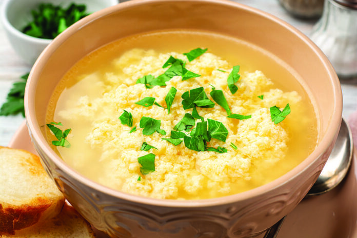 - Using a fork, drizzle eggs, a little at a time into boiling broth. Eggs will cook immediately.
