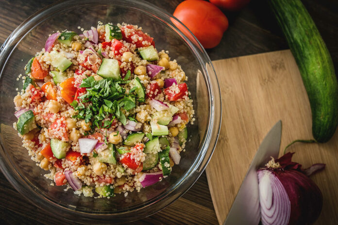 2. In a medium bowl, stir together cooked quinoa, cucumber, parsley, mint, red onion, red pepper, pistachios, chickpeas, lemon juice, olive oil, salt, pepper and feta.
