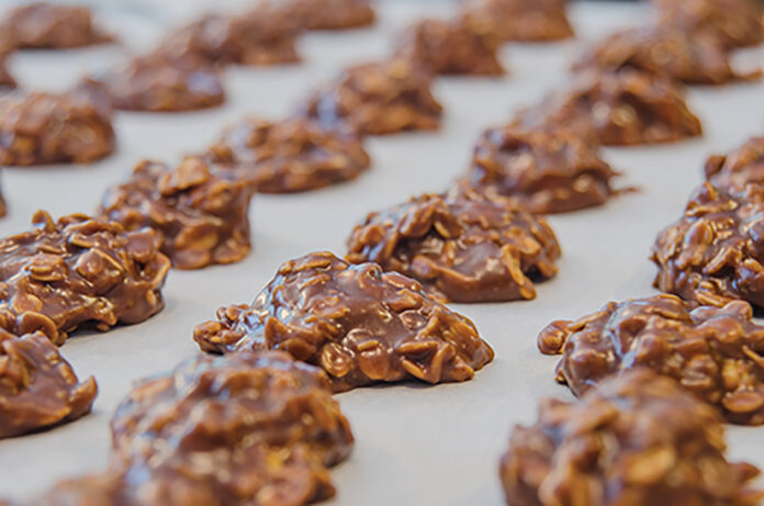 3. Remove from heat, immediately add in vanilla, peanut butter and quick oats. Do not use old fashioned oats. Stir mixture until well combined and then, using a medium cookie scoop or two spoons, drop mixture onto lined baking sheets.