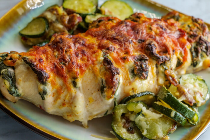 - Stuff all of the spinach and ricotta mixture into the slits. Season the chicken with garlic powder, salt and pepper. Grate the cheese and sprinkle it generously on top. Shake the ground paprika over the chicken to add some color.