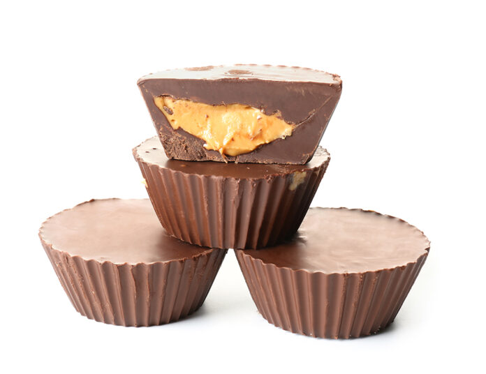 - Press about 1/2 tablespoon of filling into each chocolate cup. Spoon about 1/2 teaspoon of melted chocolate on top of filling; spread to cover.
