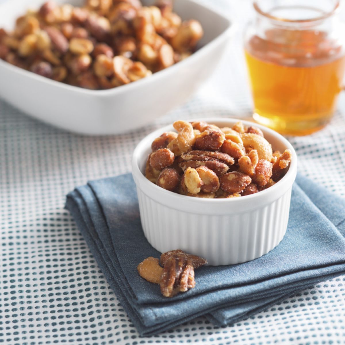1. Combine honey, butter and 1/2 tsp. cinnamon in saucepan; bring mixture to boil and boil 2 minutes stirring constantly. Pour honey mixture over nuts and mix until nuts are coated.