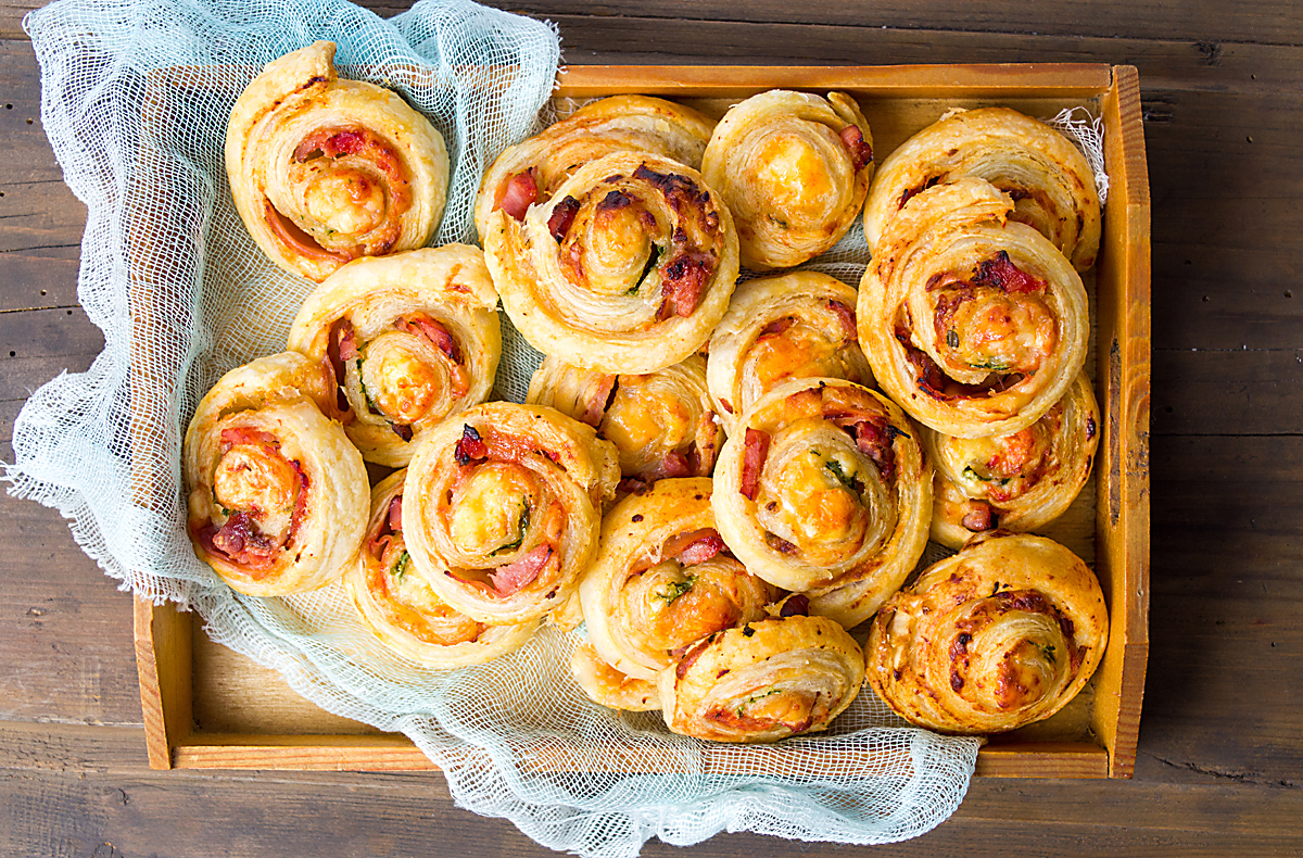 - In a medium bowl, mix together cream cheese, cheddar cheese and bacon. Set aside while you prepare the puff pastry.