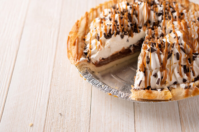 - Remove plastic wrap and garnish with whipped cream, chocolate pieces and caramel sauce drizzle. Cover; refrigerate leftover pie.