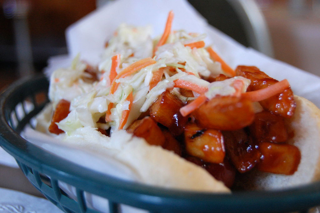 - Equally divide BBQ sauce and place on top of kielbasa followed by fries and then slaw.