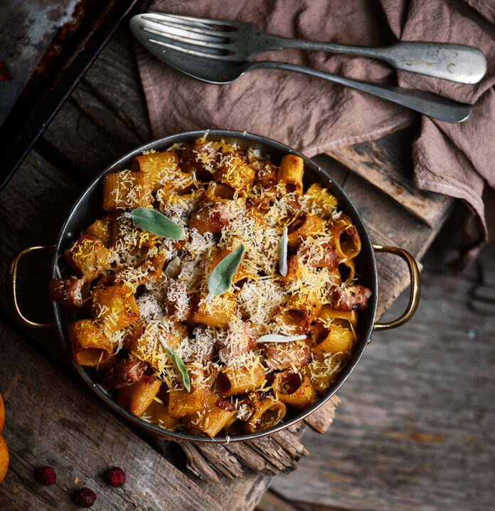 4. Return sausage to pan, reduce heat and stir in cream. Season the sauce with the cinnamon and nutmeg, and salt and pepper to taste. Simmer mixture 5 to 10 minutes to thicken sauce. Add the cooked pasta to the pan and gently toss to combine. Thin the sauce with a bit of the reserved pasta water as needed if it seems too thick. Season with salt and pepper.