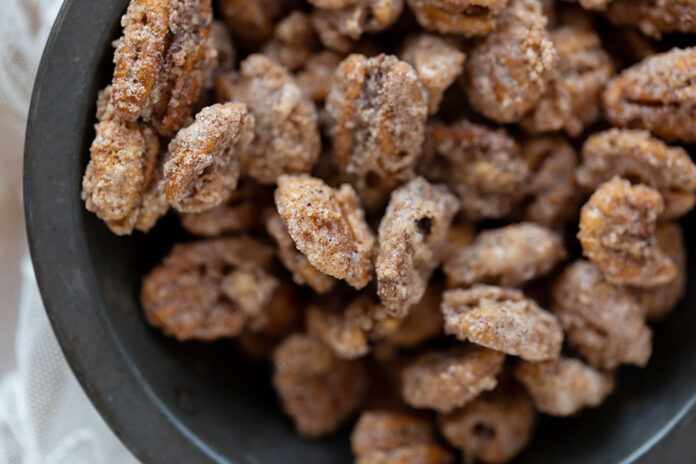 - In a separate bowl, stir together the sugar, brown sugar and ground cinnamon until well combined. Pour cinnamon and sugar mixture on top of the pecans and toss so that the pecans are fully coated with the sugar mixture.
