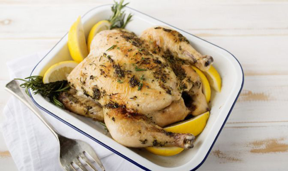 - In small bowl, mix together butter, lemon zest, garlic, thyme, rosemary, salt and pepper. Rub all over chicken.