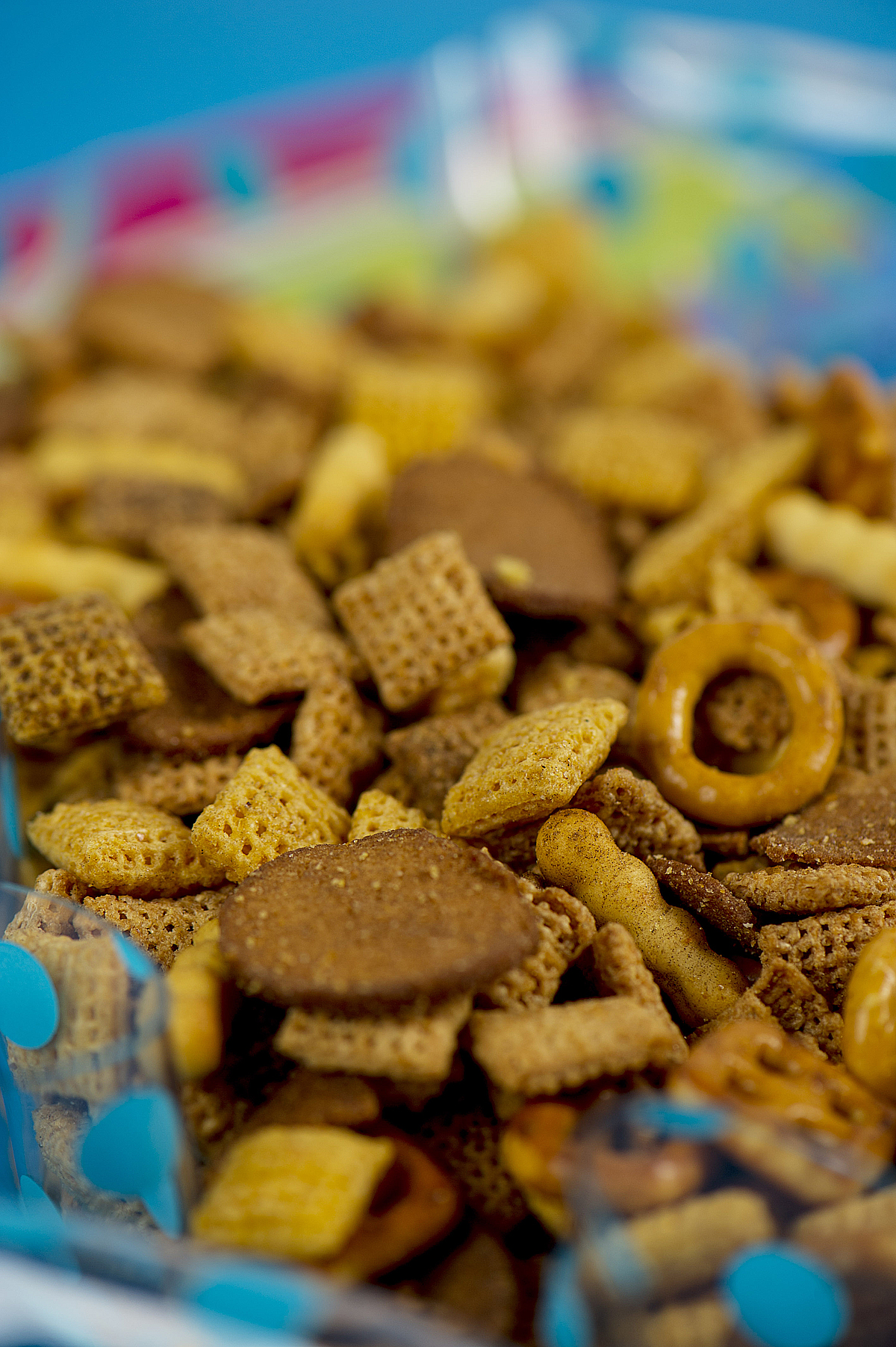 - Mix cereal in either two bowls or one large bowl with pretzels and peanuts.