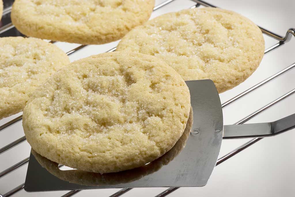 - Shape into balls about one-inch in diameter. Place balls of dough about 3 inches apart on lightly greased cookie sheet. Press cookies flat with the bottom of a glass which has been dipped in flour. If desired, sprinkle with granulated sugar.