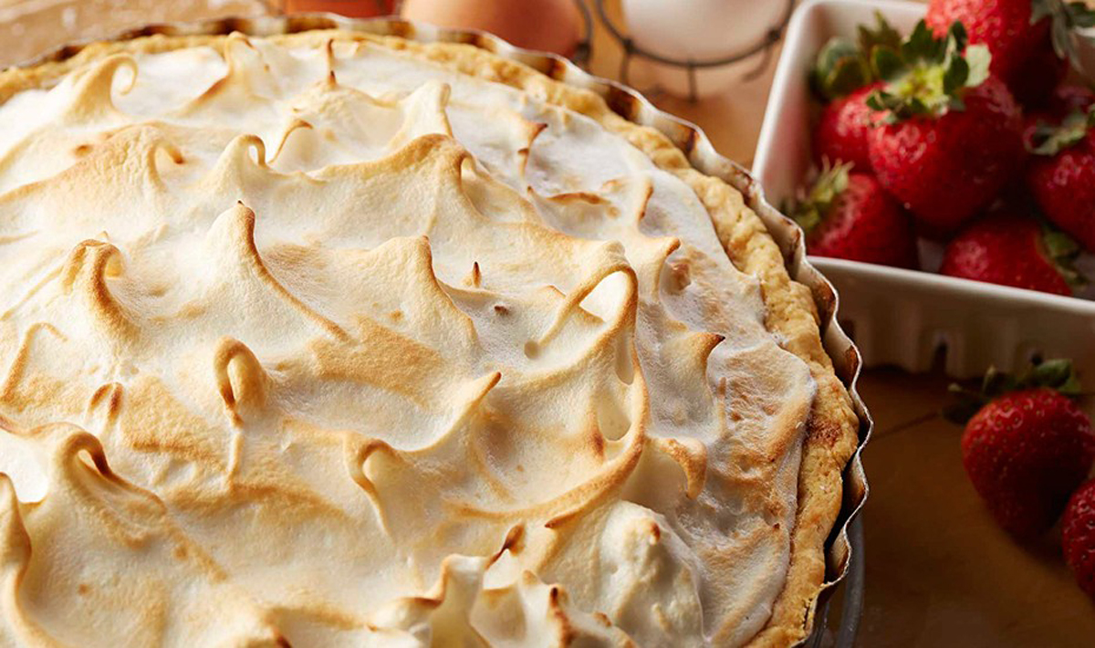 Strawberry Rhubarb Custard Meringue Pie Yield: 8 servings Ingredients: 1-1/4 cups sugar 1/2 cup all-purpose flour 5 Egg yolks, beaten 3/4 cup half-and-half 1 tsp. vanilla 2 cups sliced fresh OR frozen rhubarb 1 cup sliced strawberries 1 Basic Egg & Lemon Juice Piecrust (9-inch), unbaked MERINGUE: 1 Tbsp. cornstarch 1/3 cup cold water 5