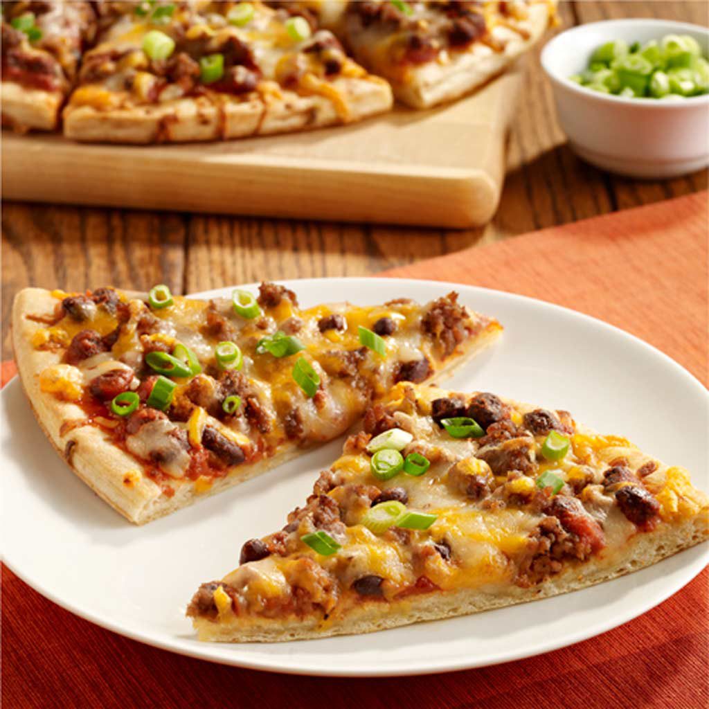 Ingredients: 1 can (8 ounce each) tomato sauce-no salt added 1/2 cup (1/2 of 15-ounce can) drained, rinsed black beans 2 tablespoons (1/2 of 1.25-ounce pkg.) taco seasoning mix 1/2 pound ground round beef (85 percent lean) 1 prebaked pizza crust (12-inch) 1 cup shredded Cheddar and Monterey Jack cheese blend 1/4 cup sliced green