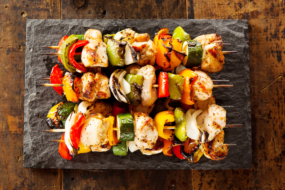 Grilled Shish-Kabobs Ingredients: 1½ lbs. boneless skinless chicken breasts cut into bite-sized pieces 2 Tbsp. olive oil 1 lemon juiced 4 garlic cloves minced 1 tsp. paprika ½ tsp. cumin ¼ tsp. garlic powder ½ tsp. salt ½ tsp. pepper 1 large red onion cut into thick slices 2 bell peppers cut into squares, any