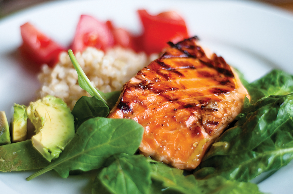 Teriyaki Salmon Salad Salad Ingredients: 3 cups cucumber, chopped 3 cups red bell peppers, chopped ¾ cup red onions, chopped 1/2 cup tomatoes, chopped 1 medium avocado, chopped 4 cups salad greens Salmon Bites: 1½ lbs. salmon fillet, skin removed ½ cup teriyaki sauce 1 Tbsp. sesame oil 1 Tbsp. cornstarch To taste salt and