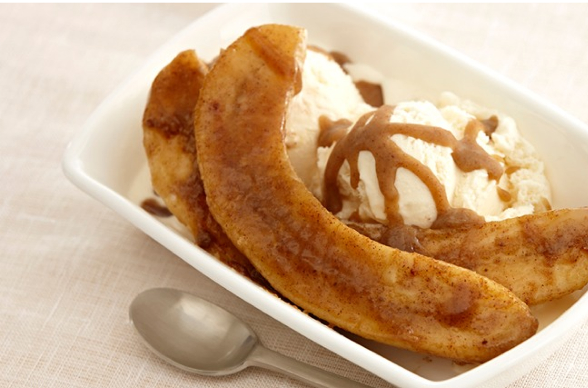Serves: 4 Ingredients: 4 bananas, peeled and halved lengthwise 1/4 cup (1/2 stick) butter, melted 2 tablespoons light brown sugar 1 teaspoon pumpkin pie spice 1 teaspoon vanilla extract 1 pint vanilla ice cream Directions: Place bananas in center of large sheet of heavy duty aluminum foil. Mix melted