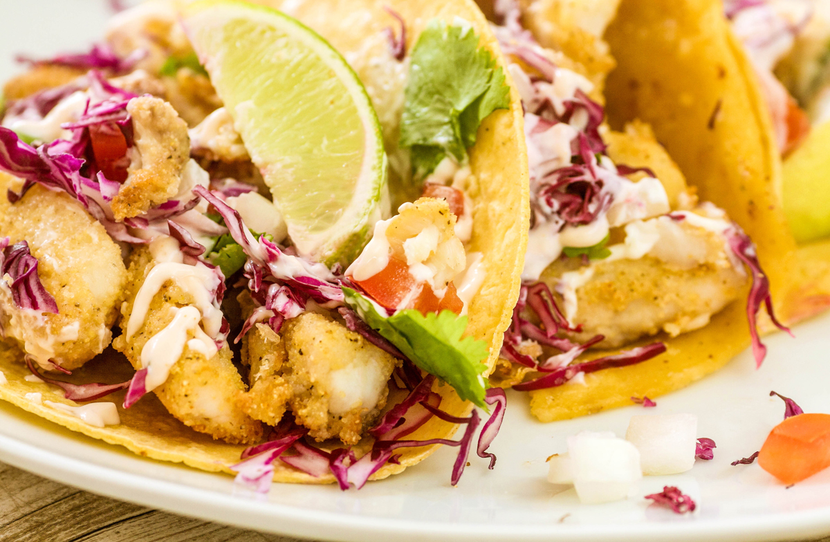 Ingredients: 2 tablespoons vegetable or olive oil 1 teaspoon ground cumin 1 teaspoon chili powder 1⁄4 teaspoon salt 1 clove garlic, peeled and minced 1 1⁄2 pound halibut fillets (or another firm white fish) 8 6-inch corn tortillas 2-3 cups Purple Cabbage Slaw or shredded cabbage 1⁄2 onion, finely chopped 1 cup chopped fresh tomato