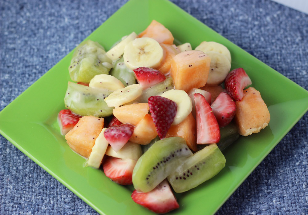 Melon Berry Banana Fruit Salad Ingredients: 1/2 cantaloupe, cut into cubes or balls 1 banana, sliced 1 cup strawberries, sliced 1 kiwi fruit, peeled and sliced 1/4 cup poppyseed salad dressing 2 Tbsp. fruit juice 1/4 tsp. dried mint (optional) Directions: Wash hands with soap and water. Gently run fruit under cool running water. Prepare