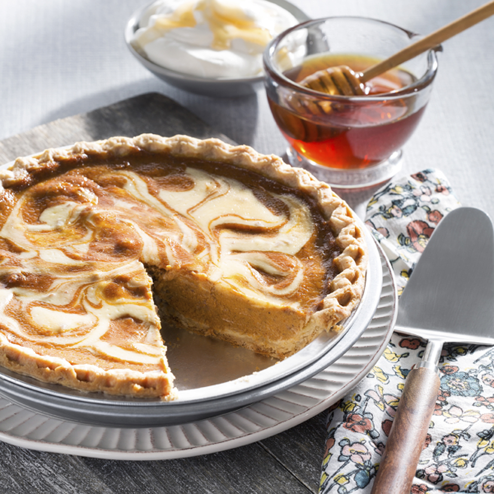 Honey Cream Pumpkin Pie Yield: 1 pie or 8 servings Ingredients: 1 frozen, unbaked 9″ deep dish pie shell For Honey Cream: 3 Tbsp. cream cheese, room temperature 2 Tbsp. honey 1 tsp. vanilla pinch of salt For Pumpkin Layer: 1 (15 oz.) can pumpkin puree 3 eggs 3/4 cup brown sugar 1 Tbsp. cornstarch