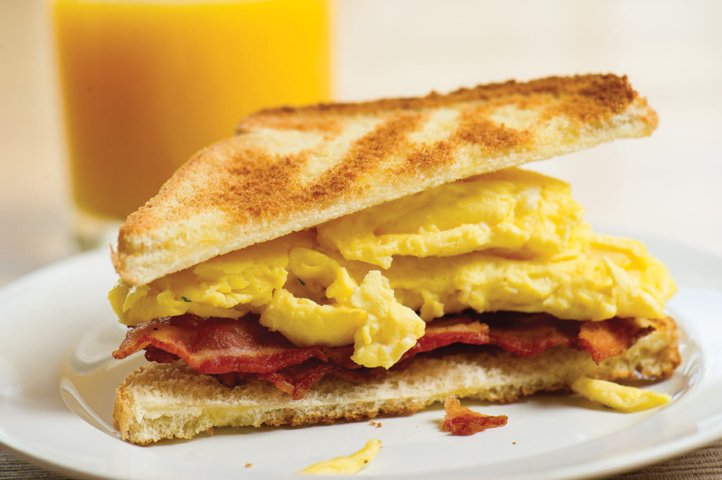 Ingredients: 2 EGGS 2 tbsp. milk OR water Salt and pepper 3 tsp. butter, room temperature, DIVIDED 4 slices whole wheat OR white bread 2 slices Co-Jack cheese 4 slices fully-cooked bacon Directions: Beat eggs, milk, salt and pepper in bowl until blended. Heat 1 tsp. butter in large nonstick skillet over medium heat until