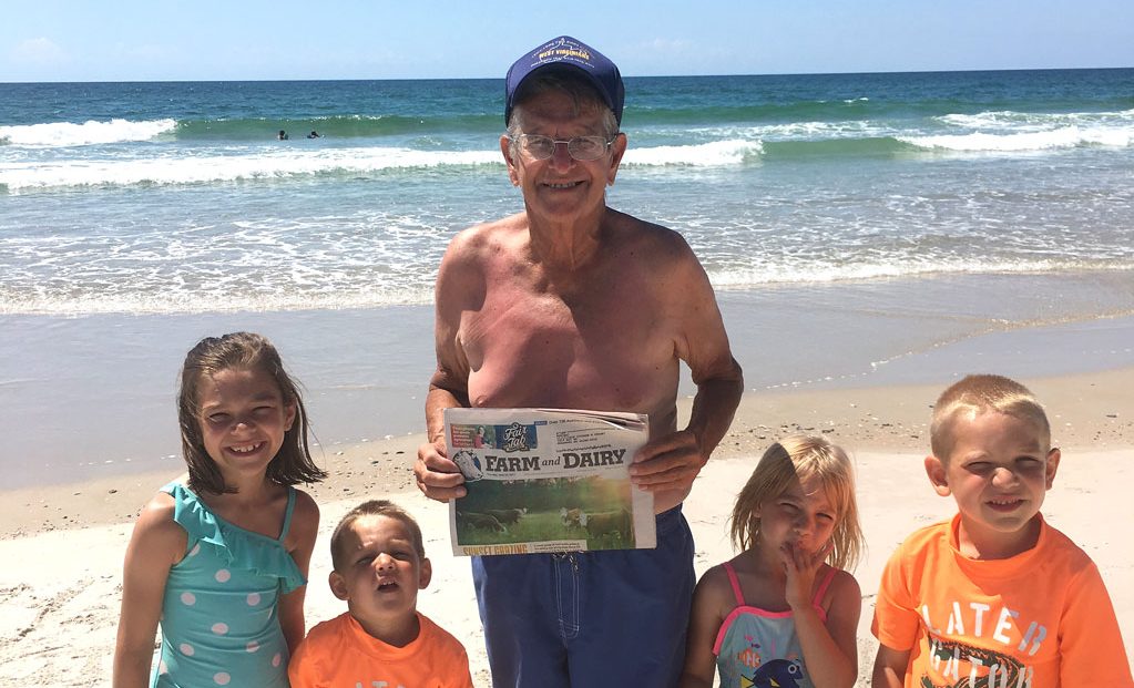 Stephen Cozart, a beef farmer from Suffield, Ohio, and long-time subscriber to the Farm and Dairy, took the paper to the beach on Topsail Island, North Carolina. He is pictured with his four grandchildren, Eliza, Jacob, Julianna and Allen.