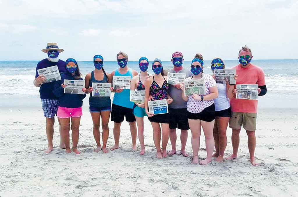 John and Sandie Rhoades (left) are pictured with family and friends on a return and “safe” trip to Topsail Beach in North Carolina the first week of June. John, who writes a religious column for Farm and Dairy (see page A25), had plenty of newspapers to go around! Pictured (left to right): John and Sandie;