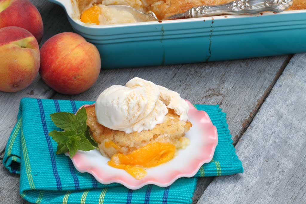 Originally published in Tri-County Farmer, August 1915 Ingredients: peaches sugar baking powder flour milk cream Directions: Pare peaches, cut in half and lay in bottom of flat baking dish. Sprinkle liberally with sugar and pour on half a cup of boiling water. Then spread thinly over top a batter made as follows: Two-thirds cup of