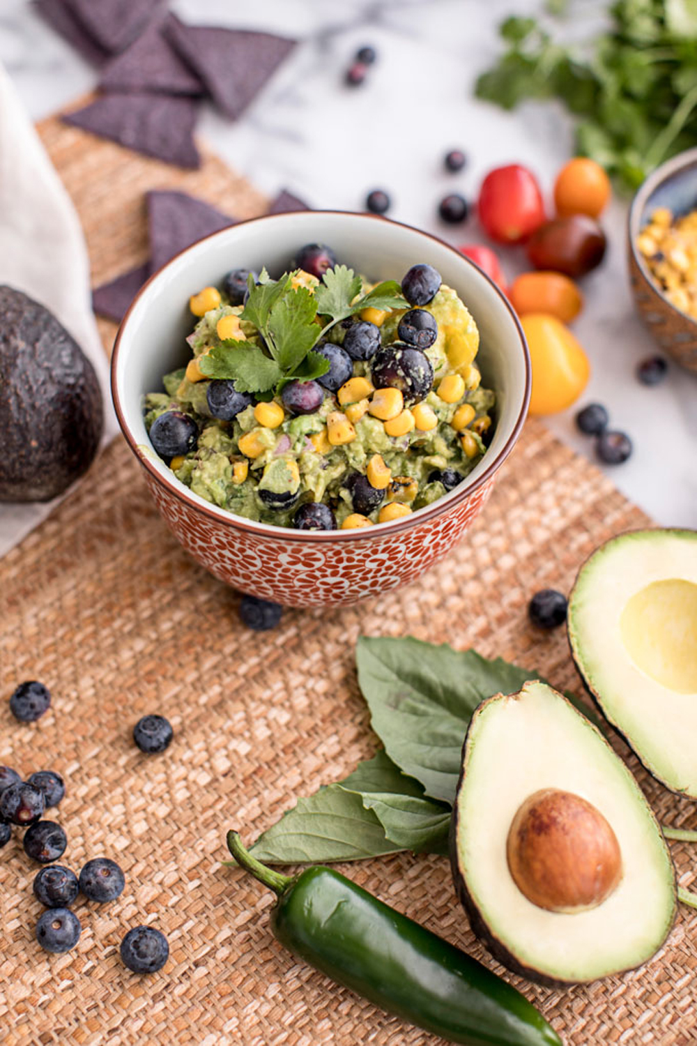 Ingredients: 1 teaspoon avocado oil 1/2 cup fire roasted corn 3 large avocado, diced 1/4 cup frozen blueberries (thawed), plus 2 tablespoons for garnish 1 clove garlic, minced 1/4 red onion, diced 1 jalapeno, diced 6 cherry tomatoes, quartered 1 teaspoon red pepper flakes 1 lime, juiced 2 tablespoons chopped cilantro 2 tablespoons chopped basil
