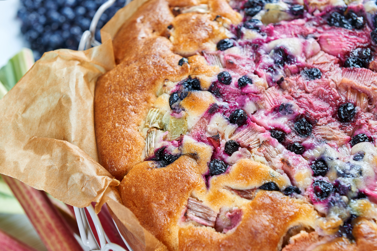 Blueberry Rhubarb Galette Ingredients: ¾ pound rhubarb, chopped (about 3 cups) 1 cup blueberries 1 cup sugar 1 Tbsp. cornstarch ½ tsp. cardamom 1 pie crust recipe 1 egg, beaten pinch of cinnamon sugar or superfine sugar Directions: Preheat the oven to 400 F. Combine the chopped rhubarb, blueberries, granulated sugar, corn starch and cardamom