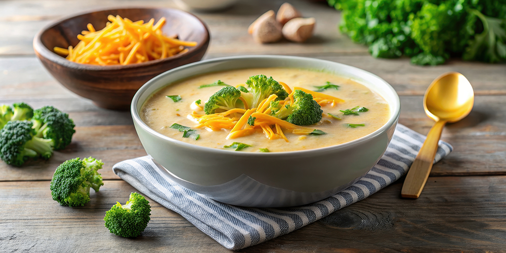 Broccoli Cheddar Soup Ingredients: 1 Tbsp. butter 1 medium yellow onion, finely chopped 1/4 cup butter 1/4 cup flour 2 cups chicken broth 2 cups half and half 12 oz. fresh broccoli, roughly chopped 2 carrots, peeled and chopped 1/2 tsp. kosher salt 1/4 tsp. paprika 1/4 tsp. garlic powder 1/4 tsp. dry mustard 1/4