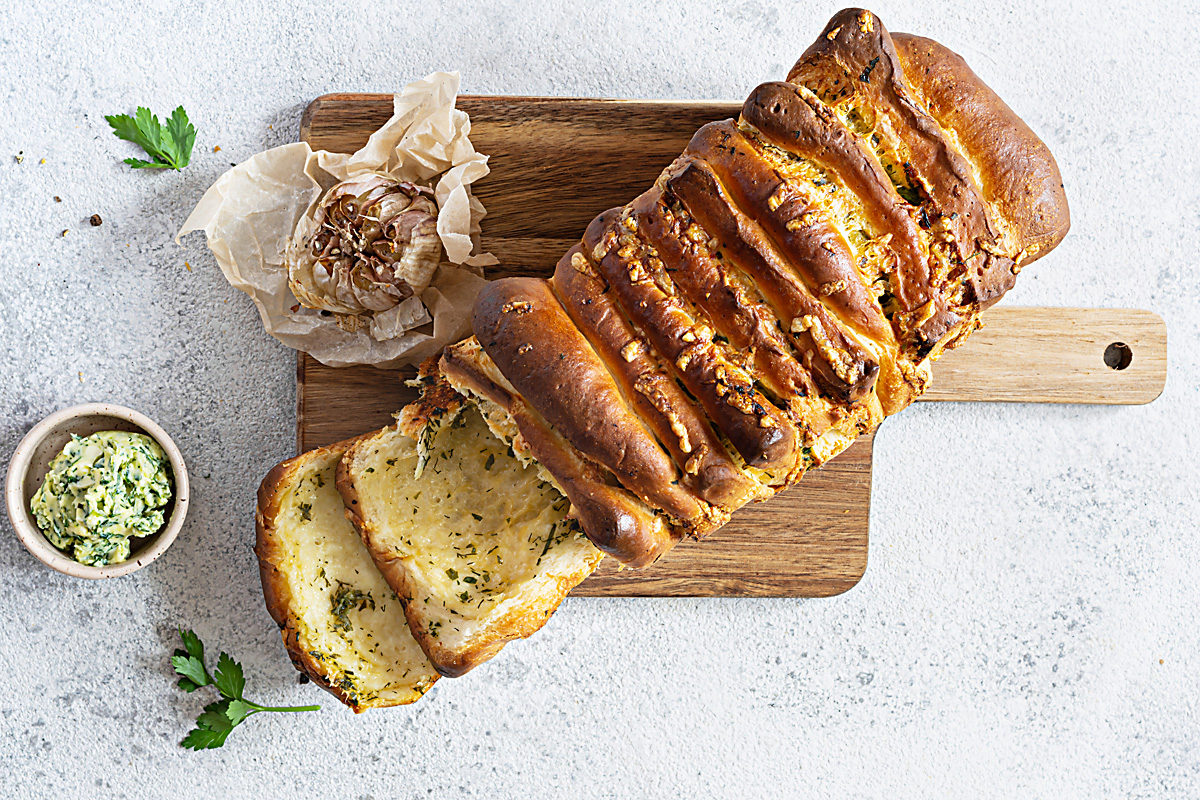Rosemary Garlic Pull-Apart Bread Ingredients for Dough: 2 1/4 cups all-purpose flour, plus more for work surface 2 Tbsp. granulated sugar 2 tsp. instant or quick-rising yeast 1 1/2 tsp. kosher salt 2/3 cup whole milk, warmed 3 Tbsp. unsalted butter, softened Ingredients for filling and topping: 6 Tbsp. unsalted butter, softened 3/4 cup Parmesan