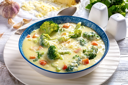 California Blend Cheese Soup Ingredients: 6 Tbsp. butter, divided 1 small onion, minced 3 cloves garlic, minced 1 cup broccoli stems, chopped 1/4 cup all-purpose flour 1 cup milk 1 cup half and half 3 cups chicken broth 2 cups broccoli florets, chopped 2 cups cauliflower florets, chopped 1 large carrot, thinly sliced 1 tsp.