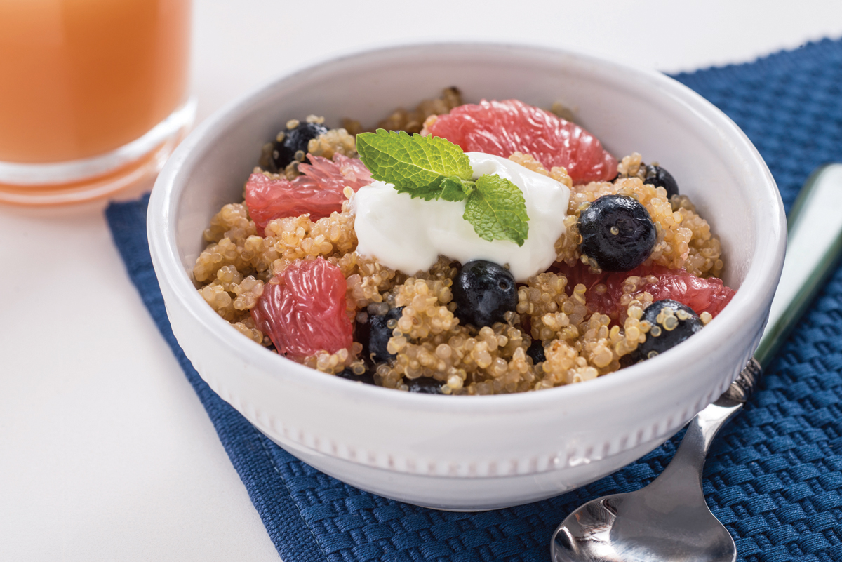 Prep time: 10 minutes Cook time: 15 minutes Serves: 4 Ingredients: 3/4 cup Florida Grapefruit Juice 1/2 cup water 3/4 cup quinoa, rinsed 2 tablespoons liquid honey or maple syrup 2 Florida Ruby Red Grapefruit, segmented 1 cup fresh or frozen blueberries 1 cup vanilla or plain yogurt fresh mint leaves Directions: In small saucepan,