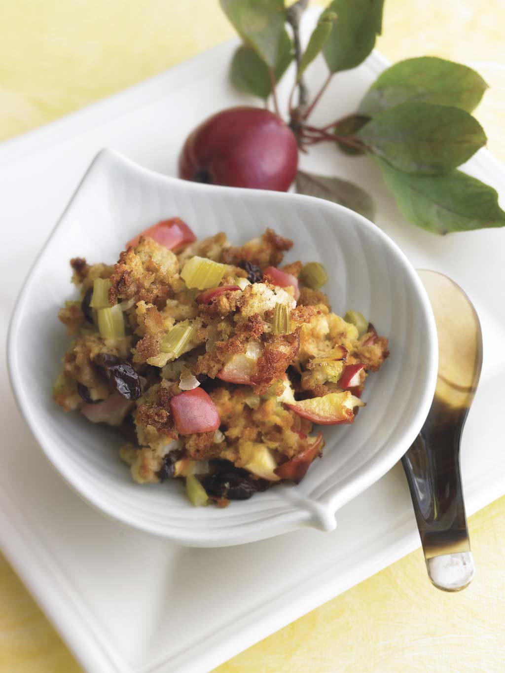 Ingredients: 1/4 cup (1/2 stick) butter 1 stalk celery, chopped (about 1/2 cup) 1 small onion, chopped (about 1/4 cup) 1 can (10 1/2 ounces) chicken broth 4 cups herb seasoned stuffing 1 medium apple, cored and chopped (about 1 cup) 1/4 cup raisins 1/4 teaspoon ground cinnamon Directions: Heat butter in 10-inch skillet over